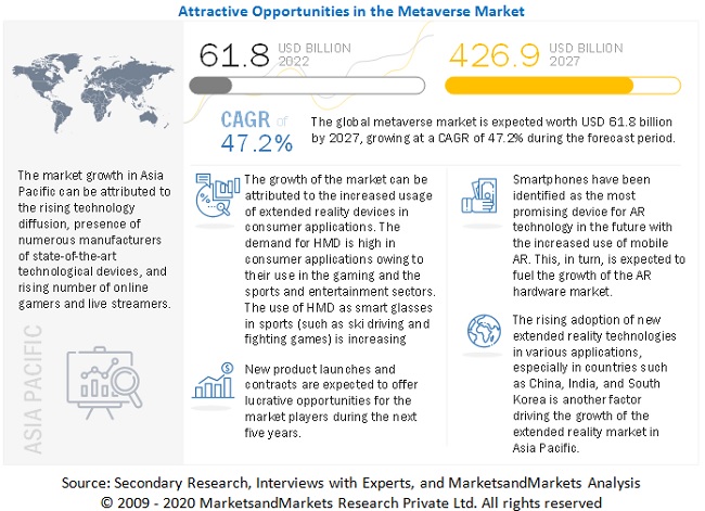 메타버스 시장이 2027년까지 연간 47.2%의 성장률을 기록하며 초고속 성장세를 이어갈 전망이다. 2022년 618억 달러로 예상되는 시장 규모는 2027년에 4,269억 달러로 증가할 것으로 추정된다. TV나 게임 콘솔과 같은 전자 제품을 구매할 때 제공하는 XR(Extended Realit) 장치가 증가하고, 미디어 및 엔터테인먼트 산업에서 확장 및 증강 현실 솔루션 수요 급증이 시장을 성장을 주도할 것으로 예상된다.