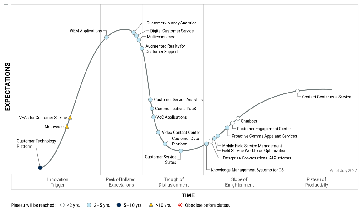 가트너는 '2022년 고객 서비스 지원 기술에 대한 하이프 사이클(Gartner Hype Cycle for CSS Technologies, 2022)'을 발표하고, 연결(Connected), 프로세스 오케스트레이션(Process Orchestration), 지식과 통찰(Knowledge and Insight), 리소스 관리(Resource Management)가 CSS (Customer Service and Support) 조직의 기술 혁신을 주도하고 있다고 밝혔다.