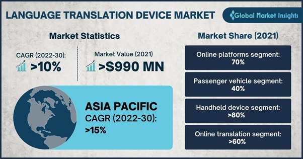 언어 번역 장치 시장 규모가 2022년부터 2030년까지 연간 10% 이상의 성장률을 기록할 전망이다. 2021년 시장 규모는 약 9억 9,000만 달러로 2030년이 되면 시장 규모가 약 25억 달러에 이를 것으로 추정했다. 데이터 기반 AI 및 기계 학습을 적용한 번역 기술 및 장치 개발이 시장 성장을 가속하고 있다. 또한 각국 정부의 디지털화에 대한 요구가 확대되고, 고속 네트워크 연결과 IoT 확산이 성장을 이끌 것으로 예상된다.