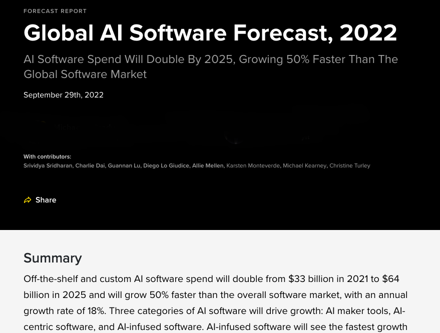 포레스터의 수석 애널리스트인 마이클 오그레이디(Michael O'Grady)는 AI 소프트웨어 시장의 잠재력과 당면 과제에 대해 "AI는 사이버 보안, 프로세스 최적화 및 자동화, 건강, 인적 자본 관리를 비롯한 여러 범주에 걸쳐 큰 잠재력을 가지고 있다. 그러나 AI 채택이 주류가 됨에 따라 기업은 책임 있는 AI 관행 준수, AI 인재 풀 육성, 비즈니스 모델의 지속적인 진화를 포함하여 복잡성을 관리해야 한다”고 밝혔다.