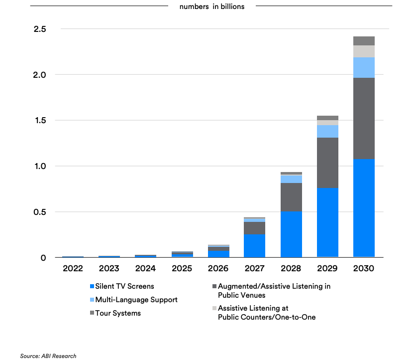 "전 세계적으로 오라캐스트 방송 오디오(Auracast Broadcast Audio)를 활용할 수 있는 시설이 6,100만 개가 조금 넘는다. 2030년까지 이 숫자는 6,400만 개로 증가할 것이다. 그러나 LE 오디오 소스 및 싱크 장치의 생태계가 발전하려면 어느 정도 시간이 필요하며, 시장에서 본격적인 변화가 시작되는 주요 변곡점은 2025년이 될 전망이다."