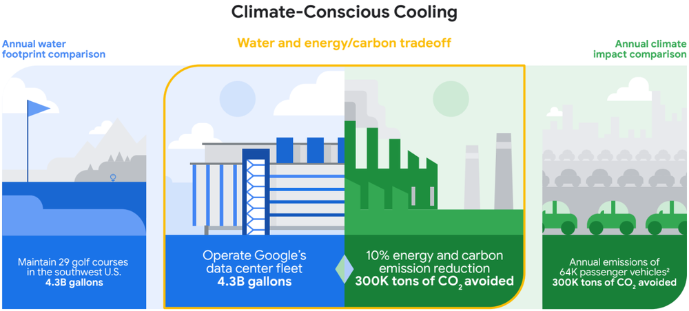 구글이 2021년 데이터 센터 냉각을 위해 사용한 물은 하루에 약 170만 리터(45만 갤런)로, 이는 약 6만 8,800 제곱미터(약 17 에이커)의 잔디에 물을 공급할 수 있는 양이다. 구글은 전력과 물 사용을 모두 줄여 에너지와 냉각 효율을 높이기 위해 노력하고 있으며, 데이터 센터에서의 물 사용량을 최대 50%까지 줄일 수 있는 새로운 냉각 솔루션을 개발하고 있다고 밝혔다.