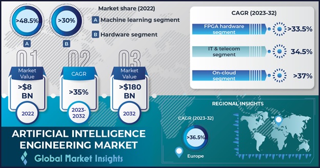 AI 엔지니어링(Engineering) 시장 가치가 2022년 80억 달러에서 2032년에는 약 1,800억 달러로 증가하며, 약 35%의 연간성장률을 기록하며성장세를 이어갈 전망이다. AI 기술이 가진 허점을 제거하는 데 집중하는 것이 비즈니스 확대를 이끄는 핵심 동력이 되고, 클라우드 컴퓨팅과 빅 데이터 분석 솔루션의 광범위한 시장 확대와 IoT 채택 증가도 성장을 이끄는 견인차 역할을 할 것으로 기대된다.