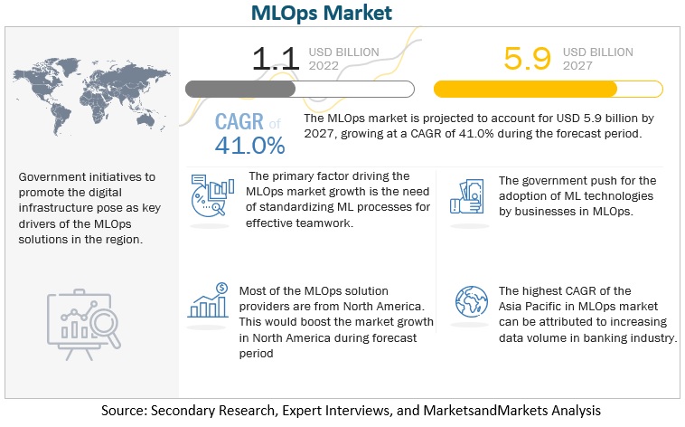 마켓앤마켓(MarketsandMarket)이 '2027년까지 글로벌 ML옵스 시장 전망(MLOps Market - Global Forecast to 2027)' 보고서를 발표하고, ML옵스(MLOps, Machine Learning Operations) 시장 규모가 2022년 11억 달러에서 2027년 59억 달러로 증가하며 연간 41%의 성장률을 달성할 것으로 예측했다.
