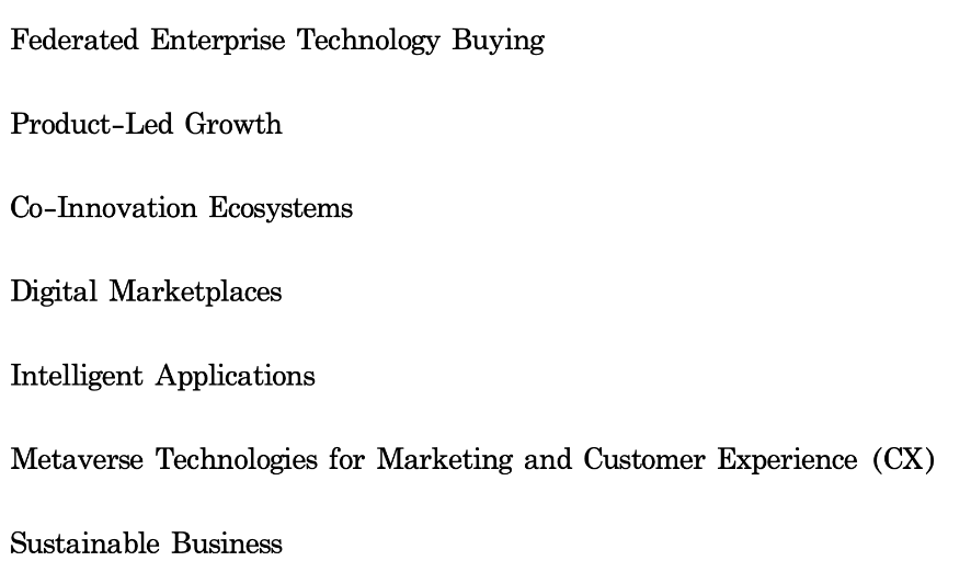 가트너는 "아래와 같은 기술들이 최소환 향후 3년 동안 전 세계 기술 고객, 구매자, 제품, 생태계, 비즈니스 모델, 운영 모델에 영향을 미칠 것이다. 디지털화의 행진은 혼란 속에서도 계속되고 있으며, 기술 제공업체는 주도적인 역할을 해야 한다. 2023년에 제품 리더와 기술 경영진은 단기 계획과 장기 전략의 균형을 유지해야 한다"고 밝혔다.