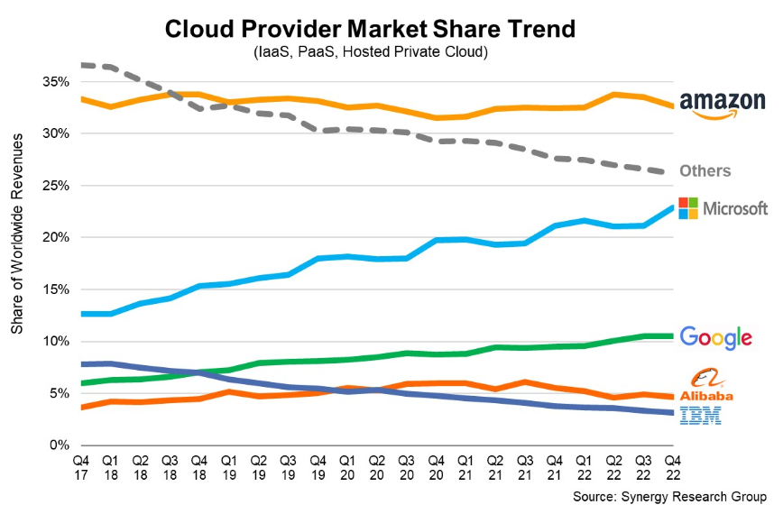"이러한 성장률의 감소는 시장 규모가 점점 더 커짐에 따라 부분적으로 예상되었지만, 현재의 경제 환경도 부정적인 영향을 미쳤다는 데 의심의 여지가 없다. 클라우드 시장을 리드하고 있는 업체 중 하나인 마이크로소프트(Microsoft)는 전 세계 시장 점유율이 증가하여, 지난 4분기 평균 21% 보다 높은 23%에 도달했다"고 시너리 리서치 그룹은 전했다.