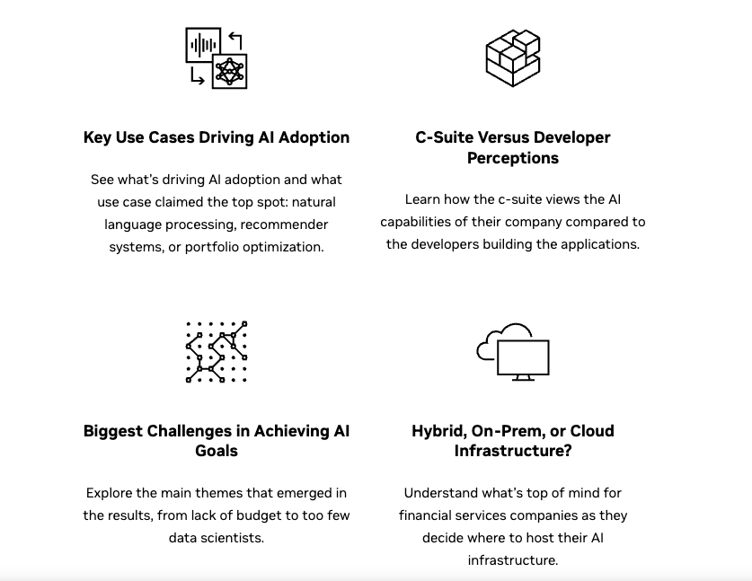 AI를 활용하는 주요 사례로는 자연어 처리 및 대규모 언어 모델(26%), 추천 시스템 및 차선 조치(23%), 포트폴리오 최적화(23%) 및 사기 탐지(22%)인 것으로 나타났다. 메타버스, 합성 데이터 생성 및 가상 세계를 위한 새로운 워크로드도 주목할만한 분야였다. 은행, 무역 회사, 헤지 펀드 등이 이러한 기술을 채택하여 개인화된 고객 경험을 창출하고 있는 것으로 조사됐다.