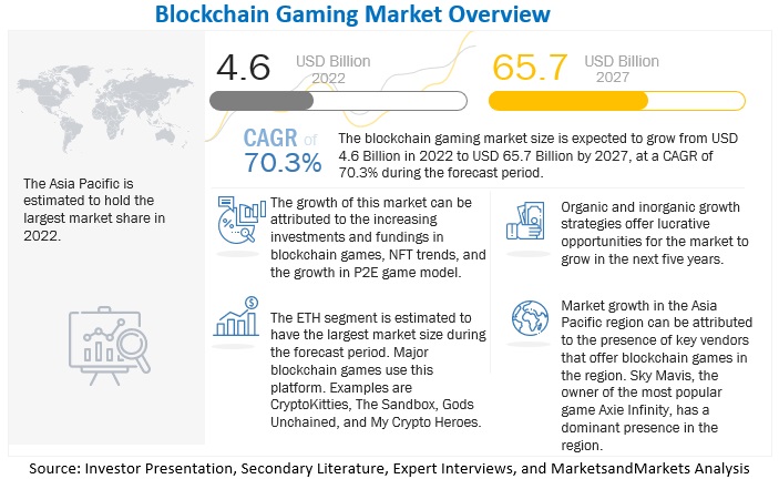 글로벌 블록체인 게임 시장이 2027년까지 70.3%의 연간 성장률을 기록하며 폭발적인 성장을 이어갈 전망이다. 2022년 46억 달러로 추정되는 시장 규모는 2027년에 657억 달러까지 성장할 것으로 예상된다. 블록체인 게임에 대한 투자가 증가하면서 게임 시장의 성장을 주도할 것이라는 전망이다. 다만, 블록체인과 NFT에 대한 제한된 인식이 시장 성장을 방해하는 요소로 지목됐다.