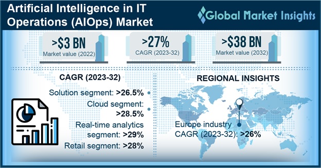 AIOps(Artificial Intelligence in IT Operations) 시장이 2023년에서 2032년까지 연간 27% 이상 성장할 전망이다. 2022년에 30억 달러를 넘어선 시장 규모는 2032년에 380억 달러에 달할 것으로 예상되며, 피싱, 해킹, 온라인 신원 도용 및 랜섬웨어 공격 등의 사이버 범죄의 급증과 IT 운영을 위한 AI 기반 서비스에 대한 수요가 시장 성장을 이끌 것으로 예측된다.
