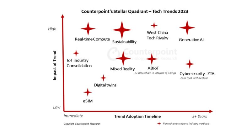 카운터포인트 리서치(Counterpoint Research)가 '2023년 기술 트렌드' 보고서를 통해 인공 지능, 디지털 트윈 및 엣지 컴퓨팅 등이 2023년 최고의 기술 트렌드로 부상할 것으로 전망했다. 또한 인공 지능, 블록체인, 사물인터넷 세 가지 분야가 융합된 ABIoT와 사이버 보안의 제로 트러스트 아키텍처(ZTA), eSIM, XR(eXtended reality) 등이 많은 투자를 받고 발전하게 될 트렌드로 지목했다.