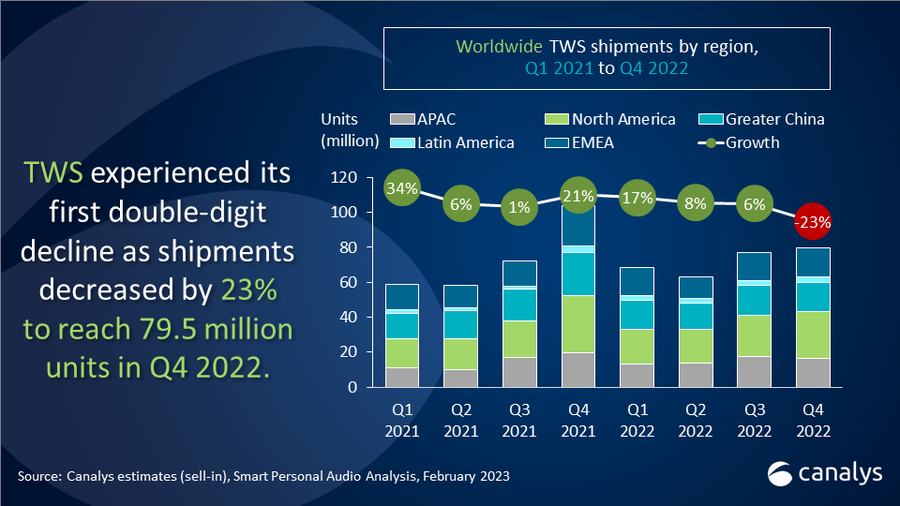 카날리스(canalys)가 2022년 4분기까지 집계한 '스마트 개인용 오디오 분석(Canalys Smart Personal Audio Analysis)' 보고서를 발표했다. 2022년 4분기 TWS 유닛은 23%, 무선 이어폰은 36%, 무선 헤드폰은 25%가 출하량이 감소했다. 특히 개인용 스마트 오디오 시장 견인에 큰 역할을 해온 TWS 출하량은 2022년 4분기 출하량이 7,950만대로 감소했다.