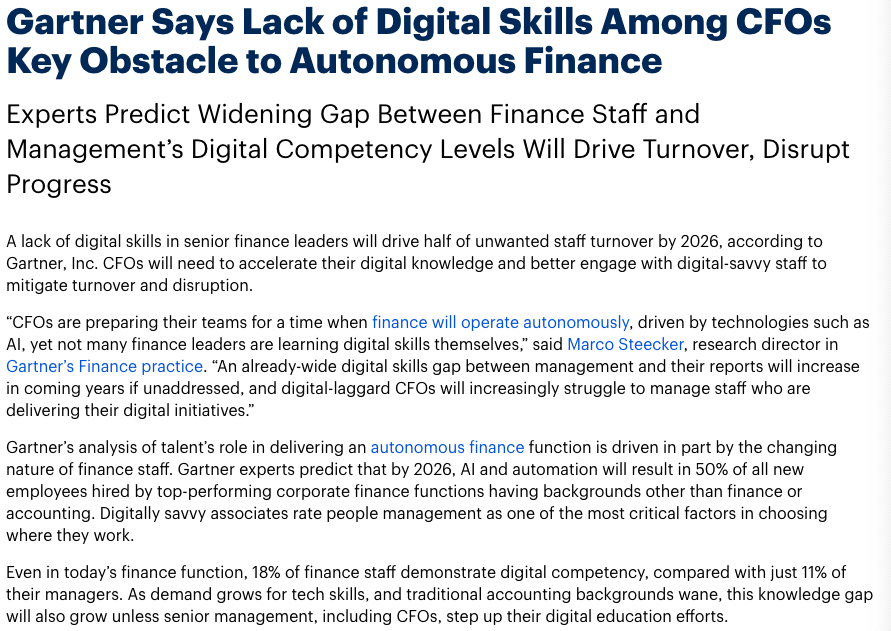 가트너의 마르코 스티커(Marco Steecker) 재무 사업부 이사는 "CFO는 AI와 같은 기술을 기반으로 한 재무 자율화 시기에 대비하여 팀을 준비하고 있지만, 많은 재무 리더가 스스로 디지털 기술을 배우는 것은 아니다. 경영진과 그들에게 업무 보고를 하는 직원 사이의 디지털 문해력 차이가 해결되지 않으면, 향후 몇 년 동안 이러한 역량 격차는 계속 증가할 것"이라고 밝혔다.
