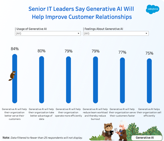 세일즈포스는 생성 AI에 대한 투자 부족이 큰 실수가 될 수 있다고 조언하면서도, IT 리더의 절반 이상이 비즈니스에서 생성 AI를 실험하거나 적극적으로 사용하면서 이미 광범위하고 빠른 초기 활용 단계에 올랐다고 전했다. 그러나 생성 AI를 통해 생산되는 콘텐츠가 정확하지 않거나 오래된 자료를 기반으로 할 경우 역효과를 낼 수 있다고 밝혔다.