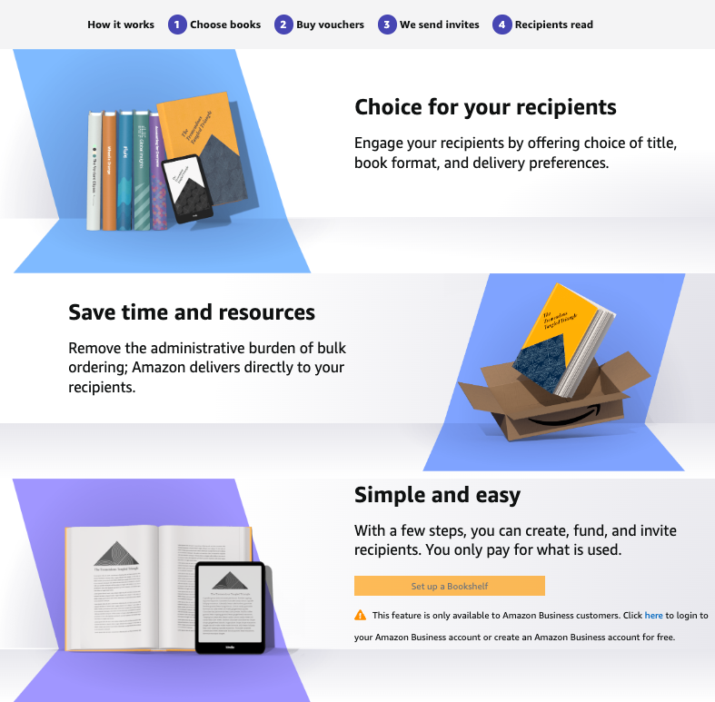 다음으로는 바우처를 받을 수신자 이메일을 업로드해서, 개인화된 초대장을 보낸다. 받을 사람이 초대장을 수락하면, 책장에 넣어둔 책에서 운하는 책을 찾아보고 도서 유형을 선택한 후 전달받은 바우처로 주문을 완료한다. 도서 형식은 킨들 전자책, 페이퍼백, 하드커버 등을 고를 수 있다. 선택한 책을 받으려면 수령인도 아마존 계정이 있어야 하는데, 기존 계정을 사용하거나 없다면 무료 계정을 만들면 된다.