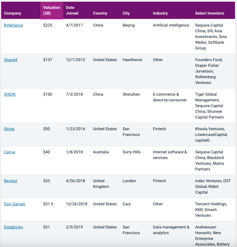 전체 유니콘 중에서 시장 가치가 가장 높은 기업은 AI 분야로 분류한 바이트댄스(ByteDance)다. 2017년 4월 7일 유니콘에 반열에 올랐으며 2023년 3월 기준 시장 가치는 2,250억 달러로 평가받고 있다. 2위는 1,370억 달러의 기업 가치를 인정받고 있는 스페이스X, 3위는 1,000억 달러의 가치를 지닌 중국의 전자상거래 및 소비자 직접 판매 업체인 셰인(SHEIN)이다.