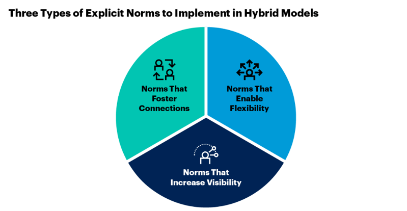 이러한 세 가지 범주를 중심으로 한 명시적이고 투명한 하이브리브 작업 모델과 규범을 만드는 것이, 업무 과정에서 발생하는 마찰이나 불만을 줄이고 직원들의 참여를 높일 수 있다는 것이다. 달라진 직장, 사회, 문화 환경을 고려해서 그것에 맞는 건전하고 긍정적인 조직 문화의 변화를 이끌기 위해서는 일관성 있고 유연한 상호 간의 약속이 필요한 셈이다.