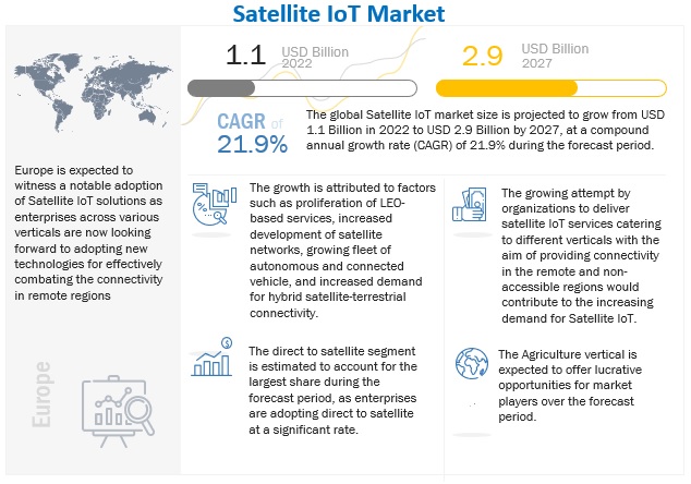 위성 IoT 시장 규모가 2022년 11억 달러에서 2027년 29억 달러로 커지며 21.9%의 연간 성장률을 기록할 전망이다. 자연재해나 재난, 오지에서의 통신 서비스, 실시간 데이터 및 이미지에 액세스 할 수 있는 방위 조직의 위성 IoT 솔루션 증가가 시장 성장을 이끌고 있다. 특히 위성 직접 연결(Direct-to-Satellite)은 신속한 배치가 가능하고 기반 시설이 필요 없어 위성 IoT 산업을 주도하고 있다.