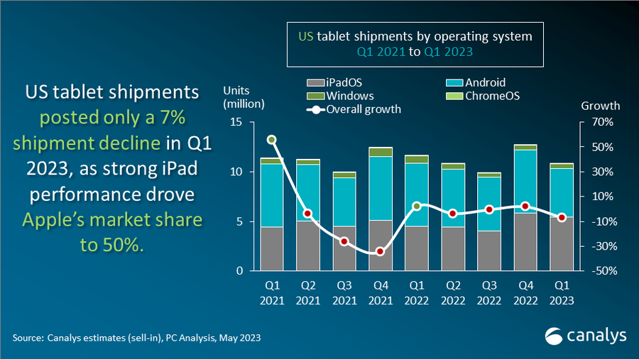카날리스가 '2023년 1분기 미국의 PC 출하량(Canalys estimate sell-in, PC Analysis, May 2023) ' 보고서를 발표했다. PC 출하량에는 데스크톱, 노트북, 워크스테이션에 포함되어 있으며, 노트북 출하량은 모바일 워크스테이션을 포함하고 있다. 태블릿의 경우는 약 1,080만 대를 출하하며 전체 출하량이 7% 감소했다.