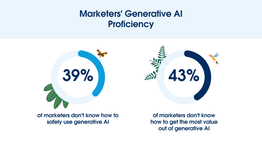 하지만 마케터의 43%가 기술을 최대한 활용하는 방법을 모른다고 답할 정도로, 많은 마케터들이 아직 준비가 되어 있지 않다고 느끼고 있는 것으로 나타났다. 마케터의 54%는 자신의 업무에서 생성 AI를 성공적으로 활용하기 위해서 생성 AI 교육 프로그램이 중요하다고 생각하지만, 70%는 고용주가 아직 생성 AI 교육을 제공하지 않는다고 응답했다. 39%는 생성 AI를 안전하게 사용하는 방법을 모른다고 답변했다.
