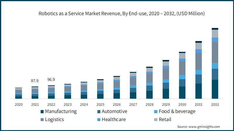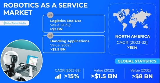서비스로의 로봇(RaaS;Robotics as a Service) 시장이 2032년까지 연간 15% 이상 성장할 전망이다. 2022년 15억에 달러에 불과했던 시장 규모는 20232년 80억 달러 이상의 커질 것으로 예상된다. 산업과 생산 공정에서의 자동화 증가, 물류와 음식 배달에서의 수요 증가가 시장 성장을 견인하는 요인으로 지목됐다.