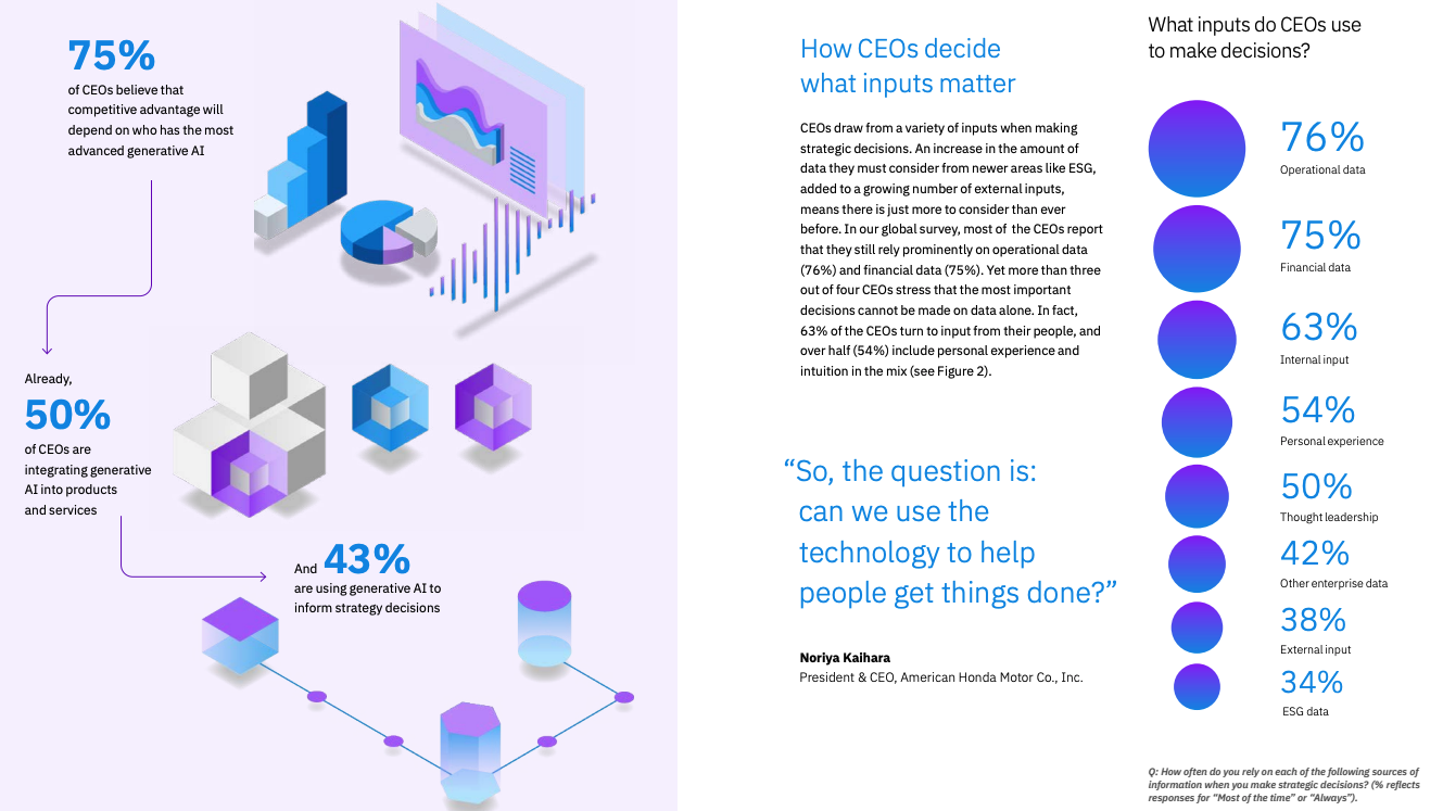 'AI 시대의 CEO 의사결정' 설문 조사에 참여한 CEO의 75%는 가장 발전된 생성 AI를 보유한 기업이 경쟁 우위를 가질 것으로 생각했으며, 43%가 전략적 결정을 내리는 생성 AI를 사용한다고 답변했다. 의사 결정을 위하 사용하는 정보는 운영 데이터, 재무 데이터, 내부 입력, 개인적 경험, 사고 리더십 등이었다. (자료 : IBM)