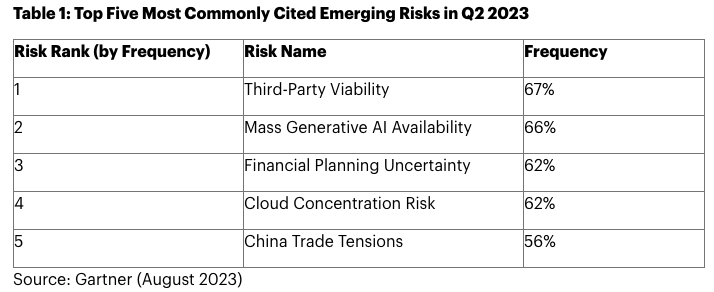 가트너가 2023년 5월 기업에서 위험 관리를 담당하는 고위 임원 249명을 대상으로 기업 경영에 위험 요소가 될 수 있는 20개 항목에 대한 설문 조사를 실시했다. 그리고 이를 기반으로 이러한 위험이 미칠 수 있는 기간, 영향, 주의 수준, 인식된 기회 등에 대한 정보를 담은 분기별 신흥 위험 보고서를 발표했다.