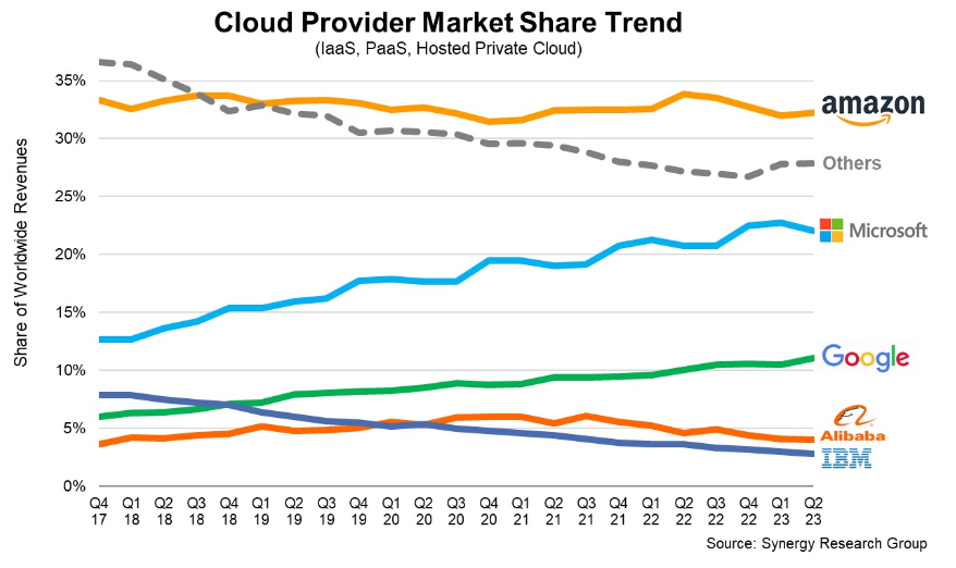 시장 점유율 1위를 달리고 있는 아마존은 여전히 선두를 지키고는 있지만 성장률은 3개 업체 중에서 가장 뒤처졌다. 시장 점유율은 아마존이 32~34%를 오가며 시장을 장악하고 있으며, 구글이 22% 마이크로소프트가 11%를 기록했다. 2023년 2분기 이들 세 개 업체가 전체 시장의 65%를 차지하고 있는 상황이다.