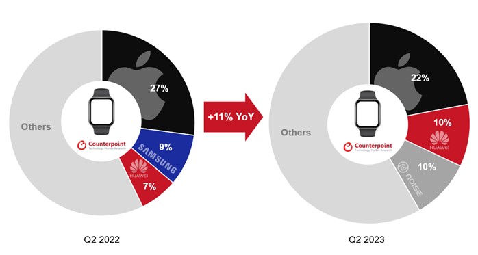 우선 스마트워치 시장에서 1위를 고수하던 애플의 출하량 점유율은 2022년 2분기 27%에서 2023년 2분기 22%로 5%가 하락했다. 출하량도 10% 감소하면서 2분기 출하량이 3년 만에 처음으로 800만 개 아래로 떨어졌다고 카운터포인트 리서치는 밝혔다. 2022년 2분기 9%의 출하량 점유율을 차지하던 삼성은 2023년 2분기에 화웨이와 노이즈(Noise)의 약진으로 3위 밖으로 밀려났다.