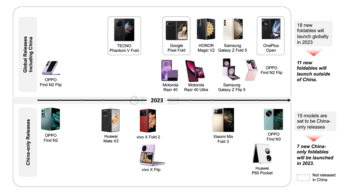 카운터포인터 리서치는 "중국 폴더블 시장의 급속한 성장은 주로 중국 시장에 맞춰진 폴더블 제품의 출시와 중국 소비자들의 이러한 제품에 대한 강한 수요 때문이다. 2023년 2분기에는 폴더블 시장의 지속적인 성장을 위한 상당한 모멘텀이 구축되고 있다. 이러한 급증은 주로 중국 폴더블 시장을 겨냥한 화웨이 메이트 X3(Huawei Mate X3), 비보 X 폴드 2(vivo X Fold 2), 비보 X 플립(vivo X Flip) 등의 출시가 한몫했다"고 전했다.