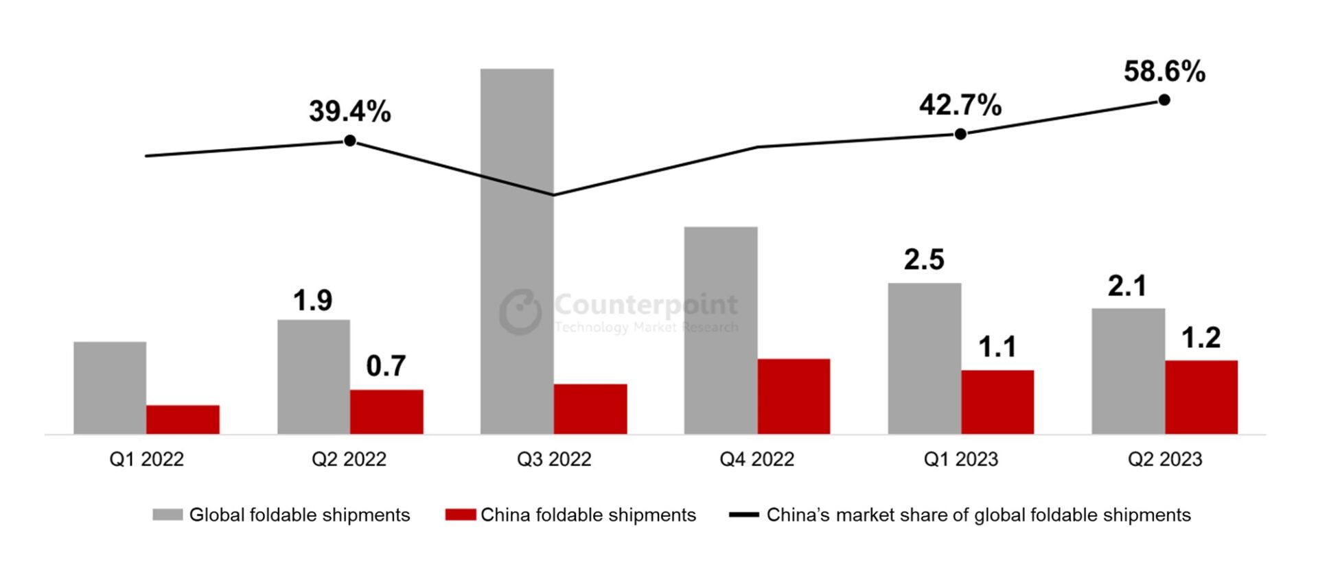 카운터포인터 리서치는 "중국 폴더블 시장의 급속한 성장은 주로 중국 시장에 맞춰진 폴더블 제품의 출시와 중국 소비자들의 이러한 제품에 대한 강한 수요 때문이다. 2023년 2분기에는 폴더블 시장의 지속적인 성장을 위한 상당한 모멘텀이 구축되고 있다. 이러한 급증은 주로 중국 폴더블 시장을 겨냥한 화웨이 메이트 X3(Huawei Mate X3), 비보 X 폴드 2(vivo X Fold 2), 비보 X 플립(vivo X Flip) 등의 출시가 한몫했다"고 전했다.