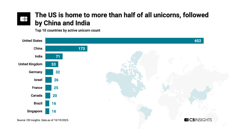 전 세계 52개 국가에서 유니콘을 배출했으며, 미국, 중국, 인도, 영국, 독일, 이스라엘, 프랑스, 캐나다, 브라질, 싱가포르 순으로 유니콘 수가 많았다. 그중에서도 미국에 자리 잡은 유니콘은 652개로 전체의 53%를 차지했다. 2위인 중국이 173개의 유니콘으로 14%를 차지한 것과 비교해도 압도적으로 많은 것을 알 수 있다.