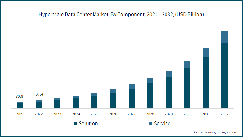 하이퍼스케일 데이터 센터 시장은 구성 요소에 따라 솔루션과 서비스로 구분할 수 있으며, 예측 기간 솔루션 부문이 약 25.5%의 연간 성장률을 기록하며 가장 높은 성장세를 이어갈 것으로 보고서는 예상했다. 솔루션 부문은 세부적으로 냉각, 전력, IT 랙 & 인클로저, 네트워크 장비 등으로 구분되며, 하이퍼스케일 데이터 센터의 시설과 규모 확장에 따라 이를 구성하고 지원하는 데 필요한 맞춤형 솔루션의 수요가 급증하고 있다.