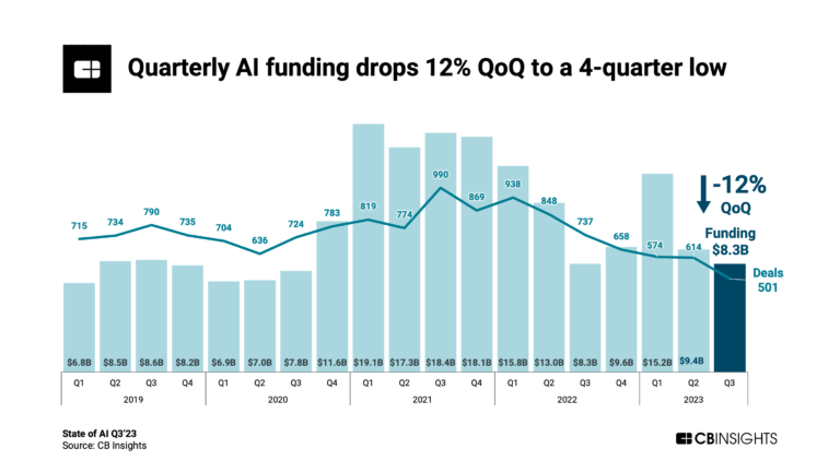CB인사이츠(CB Insights)가 '2023년 3분기 AI 현황 보고서(State of AI Q3’23 Report)'를 발표했다. AI 관련 스타트업이 2023년 3분기에 조달한 글로벌 투자금은 83억 달러로, 2023년 2분기와 비교할 때 12% 감소했다. 거래 건수는 501건으로 2023년 2분기와 비교하면 18%가 감소한 것으로 나타났다. 투자금은 4분기 만에 최저 수준이고, 거래 건수는 2017년 이후 분기 최저 수준이다.