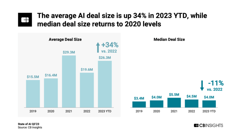 하지만 2023년 초부터 누적된 AI 기업의 평균 거래 규모는 2,630만 달러로 2022년 전체 거래 규모와 비교하면 1/3 이상 증가한 것으로 나타났다. 보고서는 오픈AI(OpenAI), 코히어(Cohere), 인플렉션(Inflection) AI 등의 생성 AI 스타트업이 올해 대규모 투자를 유치하면서 2023년 전체 평균 거래 규모가 증가한 것으로 분석했다.