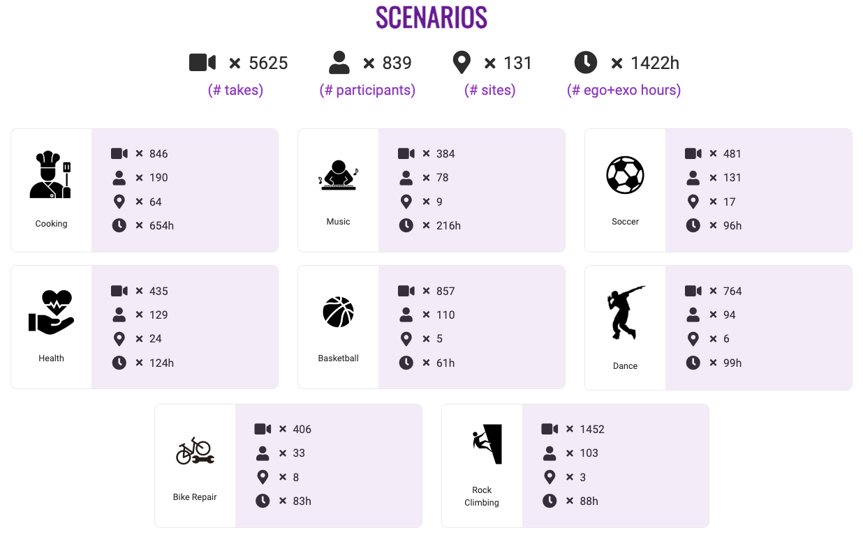 요리 데이터 세트에는 190명의 사람이 전 세계 64개의 장소에서 기록한 846개의 동영상으로 이루어진 654시간 분량의 영상이 담겨 있다. 음악 데이터 세트는 78명의 사람이 전 세계 9개의 장소에서 담아낸 384개의 동영상으로 구성된 216시간 분량의 비디오로 이루어져 있다. 축구 데이터는 131명의 사람이 전 세계 17개의 장소에서 촬영한 481개의 동영상으로 96시간의 활동을 기록했다.