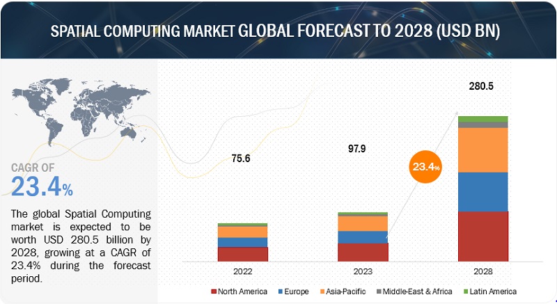 공간 컴퓨팅(Spatial Computing) 시장이 2028년까지 연평균 23.4% 성장하며 시장을 넓혀갈 전망이다. 2023년 979억 달러로 추정되는 시장 규모는 2028년 2,805억 달러로 성장할 것으로 예상된다. 공간 컴퓨팅 구성을 위한 하드웨어 장치의 보급과 실시간 렌더링 엔진 기술이 발전 등이 공간 컴퓨터 시장의 성장을 이끌 것으로 기대된다.