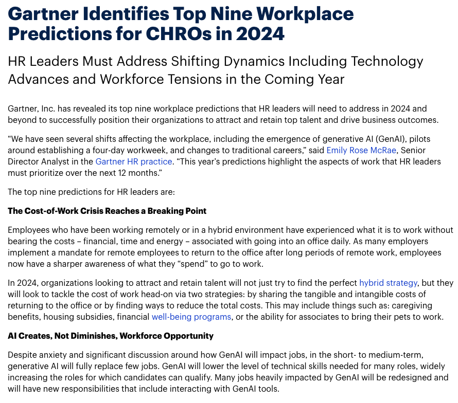 가트너는 "2024년에 인재를 유치하고 유지하고자 하는 조직은 완벽한 하이브리드 전략을 찾는 데 그치지 않고, 사무실 복귀에 따른 유형 및 무형 비용을 분담하거나 총비용을 절감할 수 있는 방법을 찾는 두 가지 전략을 통해 업무 비용 문제를 정면으로 해결하려고 노력할 것이다. 여기에는 간병 혜택, 주택 보조금, 재정적 복지 프로그램, 반려동물을 직장에 데려올 수 있도록 하는 것 등이 포함될 수 있다"고 밝혔다.