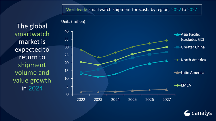 신시아 첸(Cynthia Chen) 카날리스 리서치 매니저는 "전 세계적으로 고급 스마트워치로 전환하는 추세는 신흥 지역에서 가장 뚜렷하게 나타나며, 중동과 중동부 유럽은 2024년에 스마트워치 출하량이 각각 27%와 22% 증가할 것으로 예상된다. 이 지역의 사용자들은 처음으로 일반 시계에서 스마트워치로 업그레이드할 준비가 되어 있다"고 전했다.