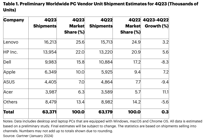가트너(Gartner)가 '2023년 4분기 전 세계 PC공급업체의 예비 출하량(Preliminary Worldwide PC Vendor Unit Shipment Estimates for 4Q23)'를 발표하고, 전 세계 PC 시장이 8분기 연속 하락세를 기록한 이후 회복 조짐을 보이고 있다고 밝혔다. 2023년 4분기 상위 6개 공급업체의 순위 변동은 없었지만 4개 업체는 전년 대비 성장하고 2개 업체는 하락을 기록했다. 이번 발표는 예비 결과로 최종 통계는 조만간 발표할 예정이다.