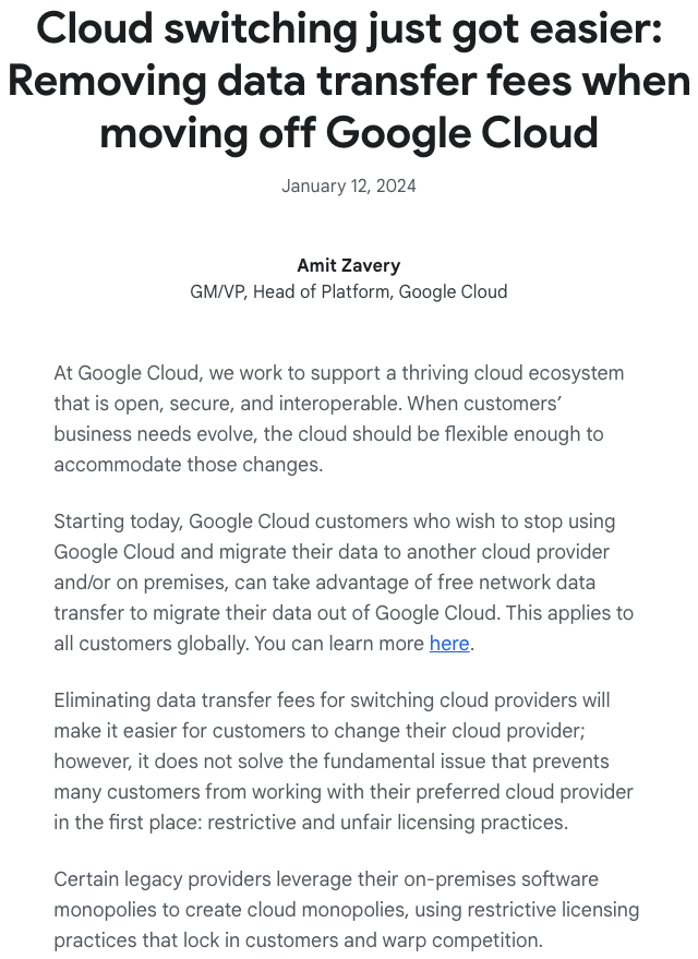 구글 클라우드 플랫폼 책임자(Head of Platform, Google Cloud)인 아밋 자베리(Amit Zavery) 부사장(GM/VP)이 구글 클라우드 블로그를 통해 '구글 클라우드 계약 종료 시 데이터 외부 이전에 전송 수수료를 받지 않는다'고 밝혔다. 즉, 구글 클라우드 서비스 이용을 종료하고 다른 클라우드나 온프레미스 환경으로 이전할 경우, 구글 클라우드 외부로 데이터 전송할 때 별도의 비용을 내지 않아도 된다는 뜻이다.