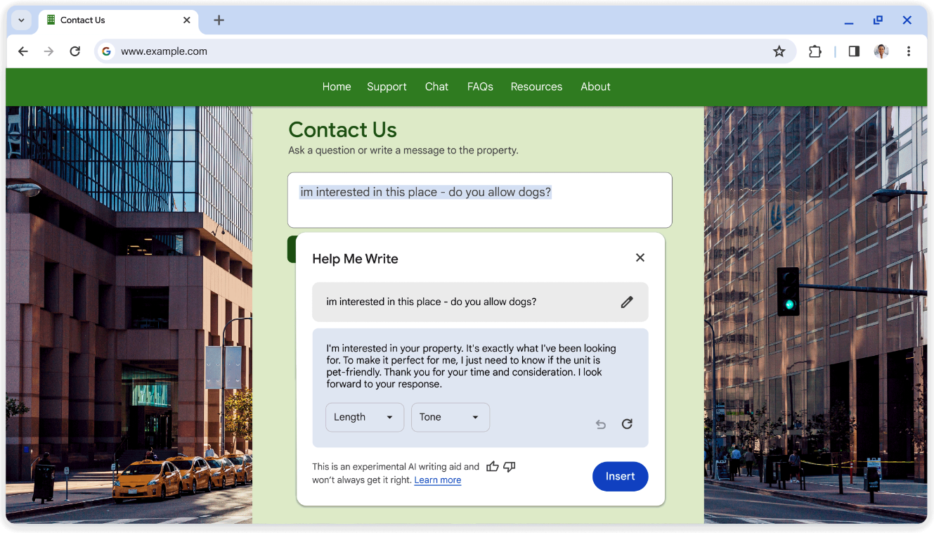 '댓글이나 리뷰 작성에 생성 AI 도움 받기'는 '글쓰기'를 유난히 어려워하는 사람들을 위한 기능이다. 공공 게시판이나 커뮤니티 등 다양한 온라인 공간에서 문의, 댓글, 리뷰, 제안 등을 작성할 때, 크롬의 생성 AI의 도움을 받아 빠르고 쉽게 글을 작성할 수 있다. 글쓰기 창에서 마우스 오른쪽 버튼을 클릭한 후 '작성 도움말'을 선택한 다음, 몇 개의 단어를 입력하면 AI가 글쓰기를 시작하고 이를 통해 좀 더 수월하게 글을 작성할 수 있다.