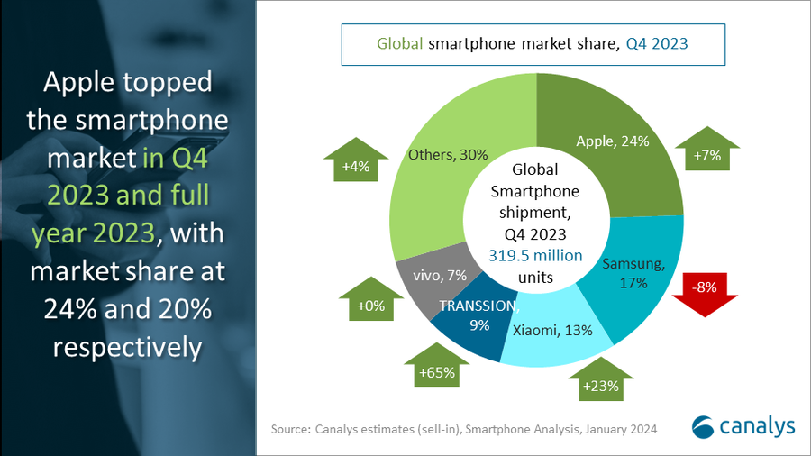 2023년 4분기에 7,810만 대를 출하한 애플은 5,350만 대를 시장에 내놓은 2위 삼성전자를 제치고 1위에 올랐다. 애플은 2022년 4분기와 비교해 연간성장률이 7% 늘어난 반면 삼성은 -8% 감소했다. 2023년 전체로 기간을 넓히면 애플과 삼성이 각각 24%와 17%의 시장을 차지한 것으로 나타났다.