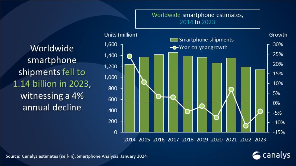 카날리스(Canalys)가 '2023년 4분기 스마트폰 마켓펄스(Canalys Smartphone Market Pulse: Q4 2023)'를 발표하고, 2024년 글로벌 스마트폰 시장이 안정화화 회복의 조짐을 보이고 있다고 분석했다. 2023년 4분기 전 세계 스마트폰 시장은 2023년 3분기 보다 8% 성장했고, 2023년 전체로 시야를 확대하면 2022년과 비교할 때 출하량이 4% 줄었다.