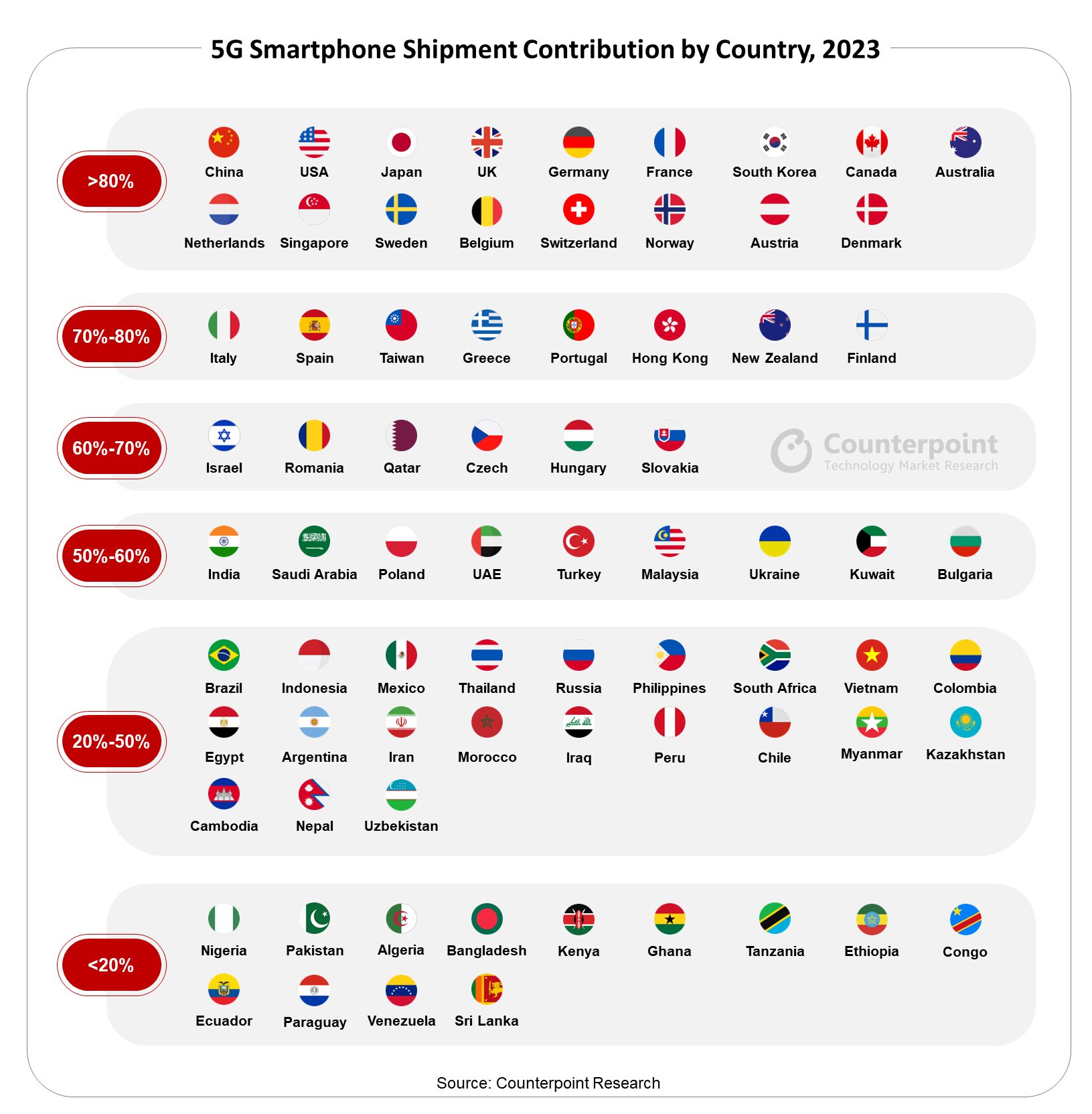 카운터포인트는 "출하된 5G 스마트폰의 70%는 미국, 중국, 서유럽 시장에서 나왔으며, 애플과 삼성전자는 누적 판매량이 10억 대를 넘었다. 2023년 전체 출하량에서 5G 스마트폰이 차지하는 비중은 프리미엄 부문을 중심으로 80%를 넘어설 것으로 예상된다. 따라서 주요 스마트폰 업체들은 5G 기능을 중급형 디바이스에 공통 기능으로 도입하는 한편, 저렴한 가격대의 디바이스에도 5G 기능을 도입하고 있다"고 밝혔다.