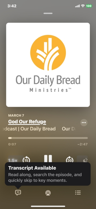 전사된 스크립트를 보고 싶을 때는 팟캐스트 재생 화면에서 왼쪽 아래에 있는 따옴표 모양의 아이콘을 선택하면 된다. 제목 아래 화면 중앙 부분에 전사된 텍스트가 표시되고, 오디오 재생에 맞춰 스크립트 부분이 동기화되며 표시된다. 단순하게 텍스트만 보여주는 것이 아니라, 쉽고 편하게 보면서 집중할 수 있도록 색상과 디자인을 신경 써서 가독성을 높인 점도 돋보인다.