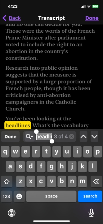 반대로 텍스트로 된 스크립트에서 원하는 단어를 선택한 후, 해당 부분부터 오디오를 재생하거나 스크립트에서 해당 단어가 있는 부분을 계속 검색하는 것도 가능하다. 선택한 단어를 복사하고, 사전에서 검색할 수도 있다. 다만, 다른 언어로 직접 번역하는 기능은 제공하지 않는다. 자동 전사된 스크립트가 제공된 이후에 에피소드 내용이 일부 변경되어,도 전사된 스크립트에는 반영되지 않는다. 또한 노래 가사는 전사 기능이 제공되지 않는다.