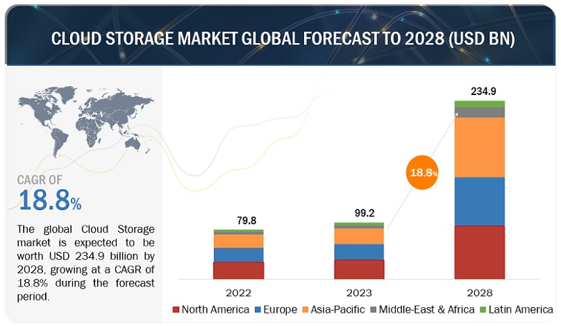 글로벌 클라우드 스토리지 시장이 2028년까지 18.8%(CAGR) 성장할 전망이다. 2023년 992억 달러로 추정되는 시장 규모는 2028년까지 2,349억 달러로 성장할 것으로 예상된다. 주요 클라우드 스토리지 공급업체가 제공하는 솔루션 간의 원활한 통합, 클라우드 에코시스템 성숙도, 운영 비용 모델로의 전환 등이 성장을 촉진하는 원동력이 될 것으로 보인다.
