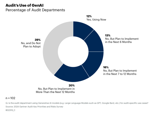 가트너(Gartner)가 최고 감사 책임자(CAE)를 대상으로 진행한 설문 조사에서 응답자의 41%가 이미 생성형 AI를 감사 업무에 활용하고 있거나 사용할 계획인 것으로 나타났다고 밝혔다. 감사 업무에서 이미 생성형 AI를 사용하고 있다고 답변한 경우가 12%, 1년 이내에 채택할 것이라고 응답한 경우가 29%에 달했다.
