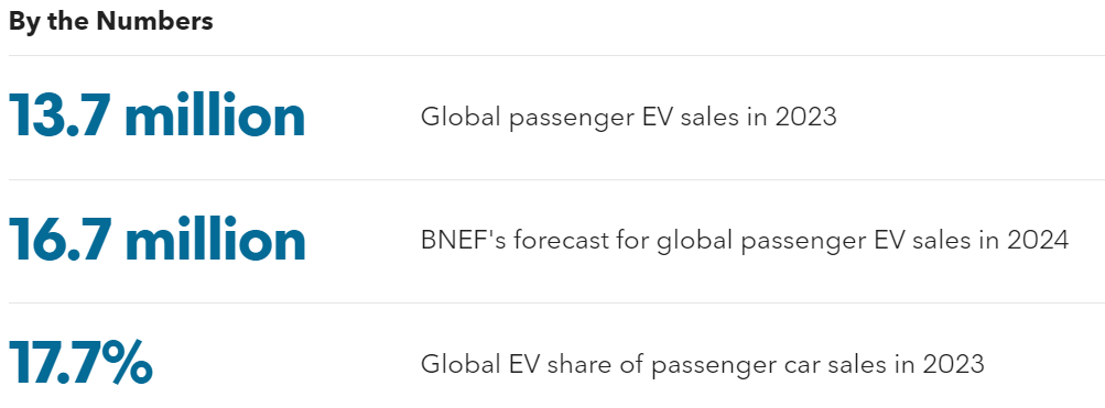 2023년 전 세계에서 판매된 승용차의 17.7%는 전기 승용차가 차지한 것으로 나타났다. 2023년에 판매된 전체 전기 승용차는 1,370만 대로 4분기에만 440만 대가 판매됐다. 2024년 전기 승용차 판매량은 약 1,670만 대에 달할 것으로 전망된다.