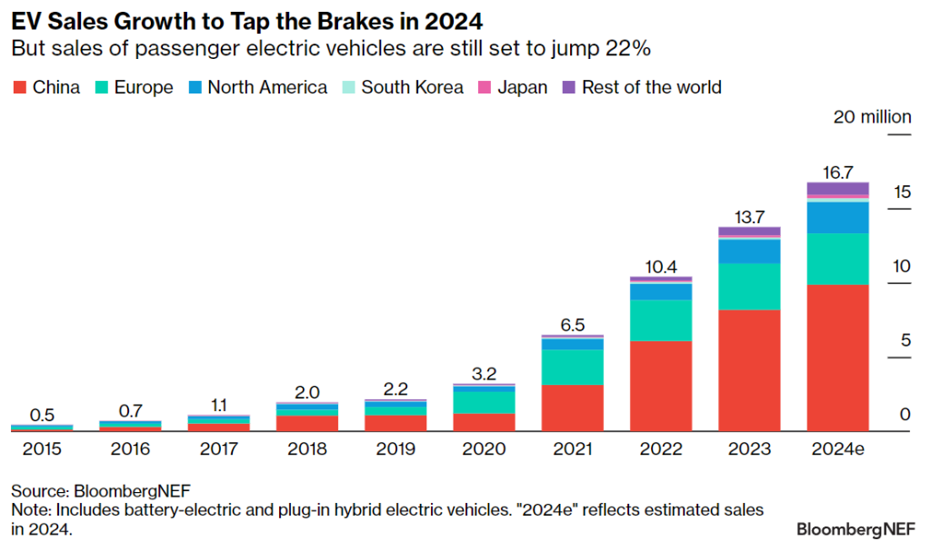 블룸버그NEF(BloombergNEF)가 ‘2024년 1분기 전기 운송 시장 전망(Electrified Transport Market Outlook 1Q 2024: Speed Bumps)’ 보고서를 발표했다. 보고서는 20224년에 전 세계에서 판매될 승용차 중에서 최대 22%가 전기차가 될 것으로 예상했다.